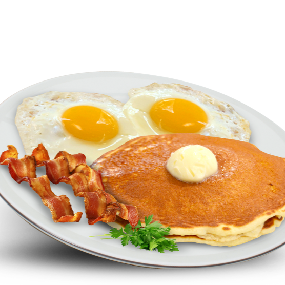 2 HUEVOS ESTRELLADOS, TOCINO Y 2 HOTCAKES INTEGRALES CON LECHERA O MIEL A ELEGIR.