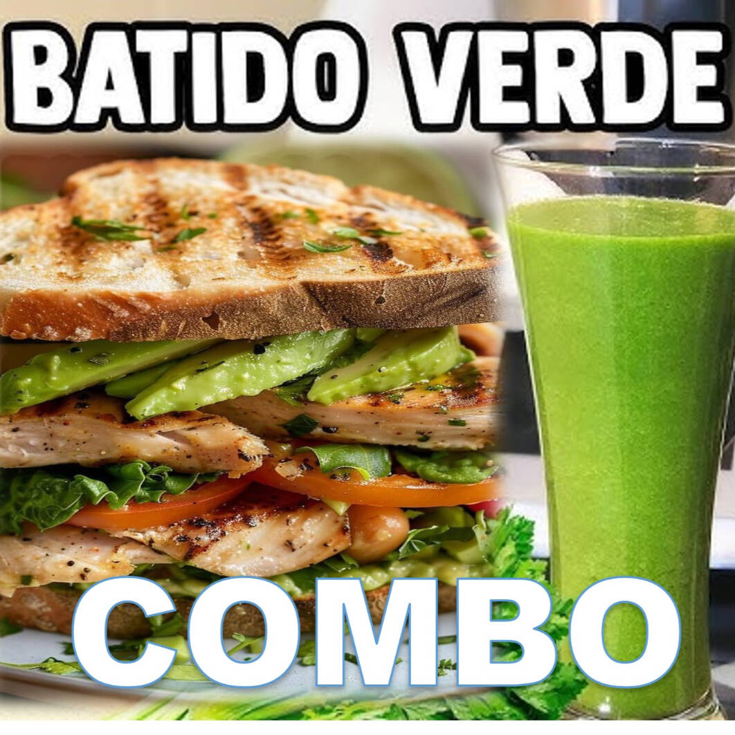 SANDWICH DE POLLO MARINADO CON VERDURAS Y AGUACATE ACOMPAÑADO DE UN JUGO NATURAL FRESCO Y RECIEN HECHO DE PIÑA, ESPINACAS Y APIO.