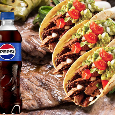 3 TACOS DE CARNE ASADA EN TORTILLA DE HARINA CON REPOLLO, AGUACATE, TOMATE Y CEBOLLA, SALSA, Y PEPSI DE 355ML