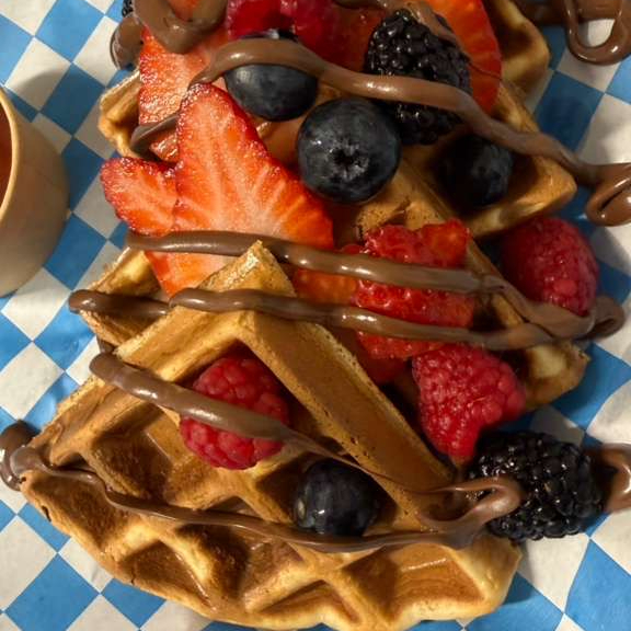 Waffle acompanado de fruta y nutella o mantequilla de mani.