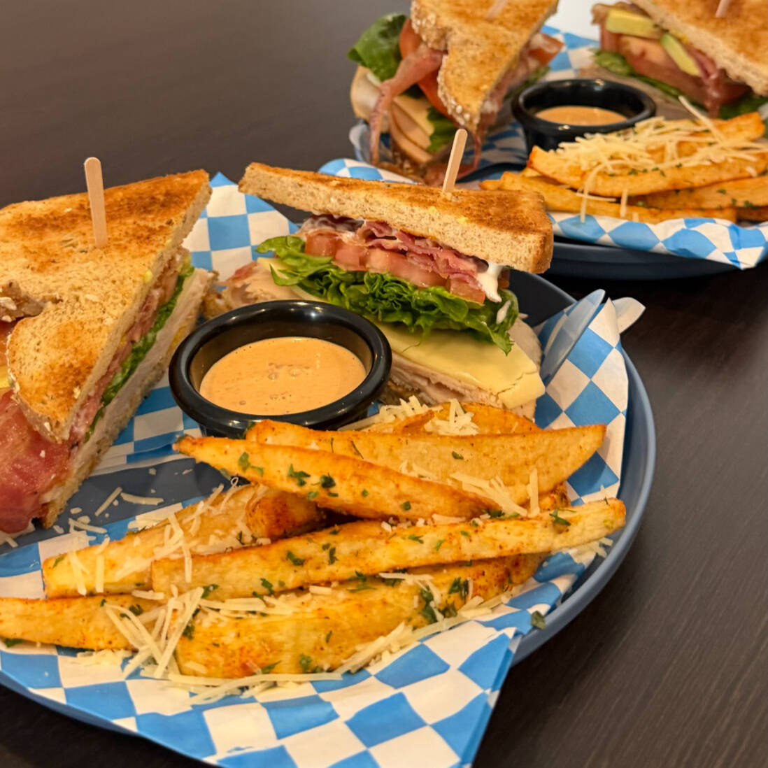 Pan blanco o multigrano, mayonesa, pechuga de pavo, tocino, queso manchego, mostaza, lechuga, aguacate, cebolla morada y tomate. Acompanado de papas fritas