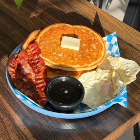 Pancakes acompanados de tocino, huevo al gusto, mantequilla y miel de maple.