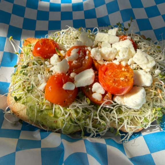 Pan 12 granos,guacamole, queso feta, alfalfa, tomate cherry, chile quebraso y especias.