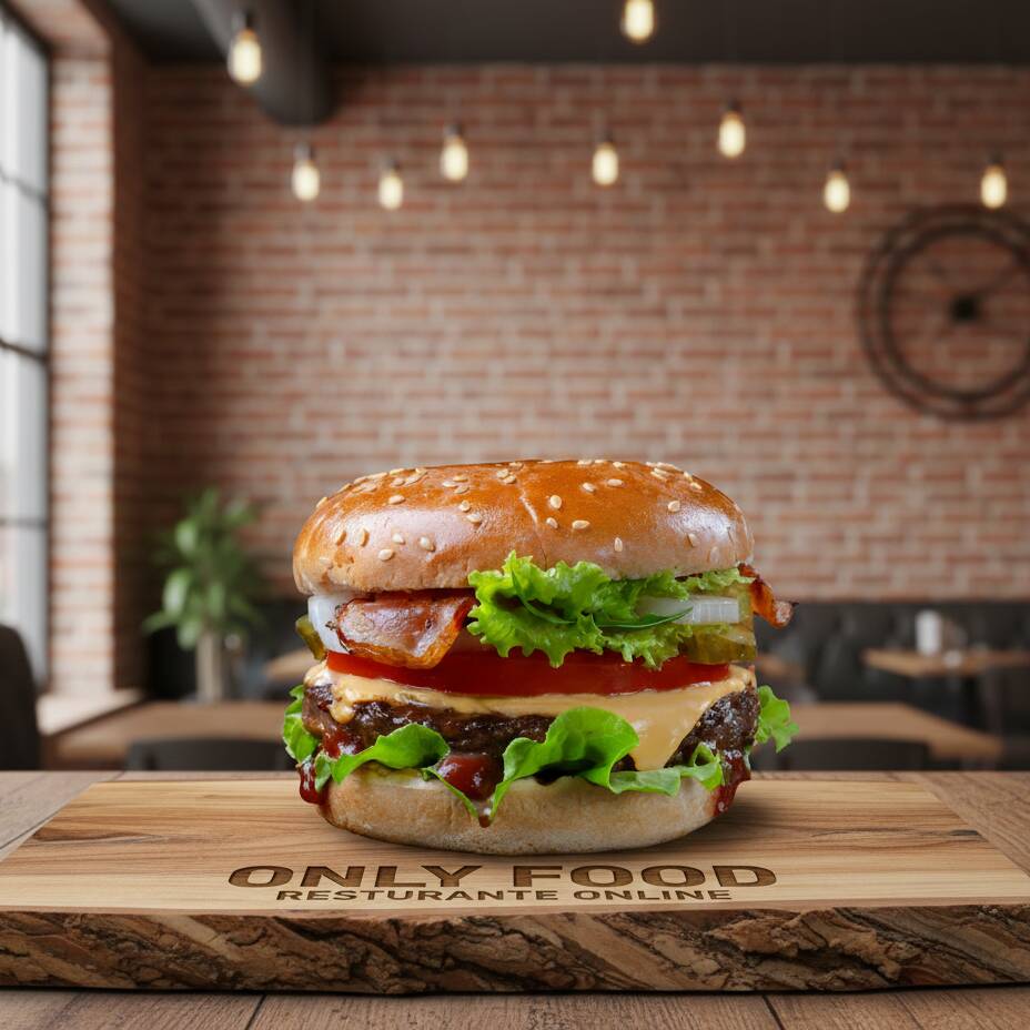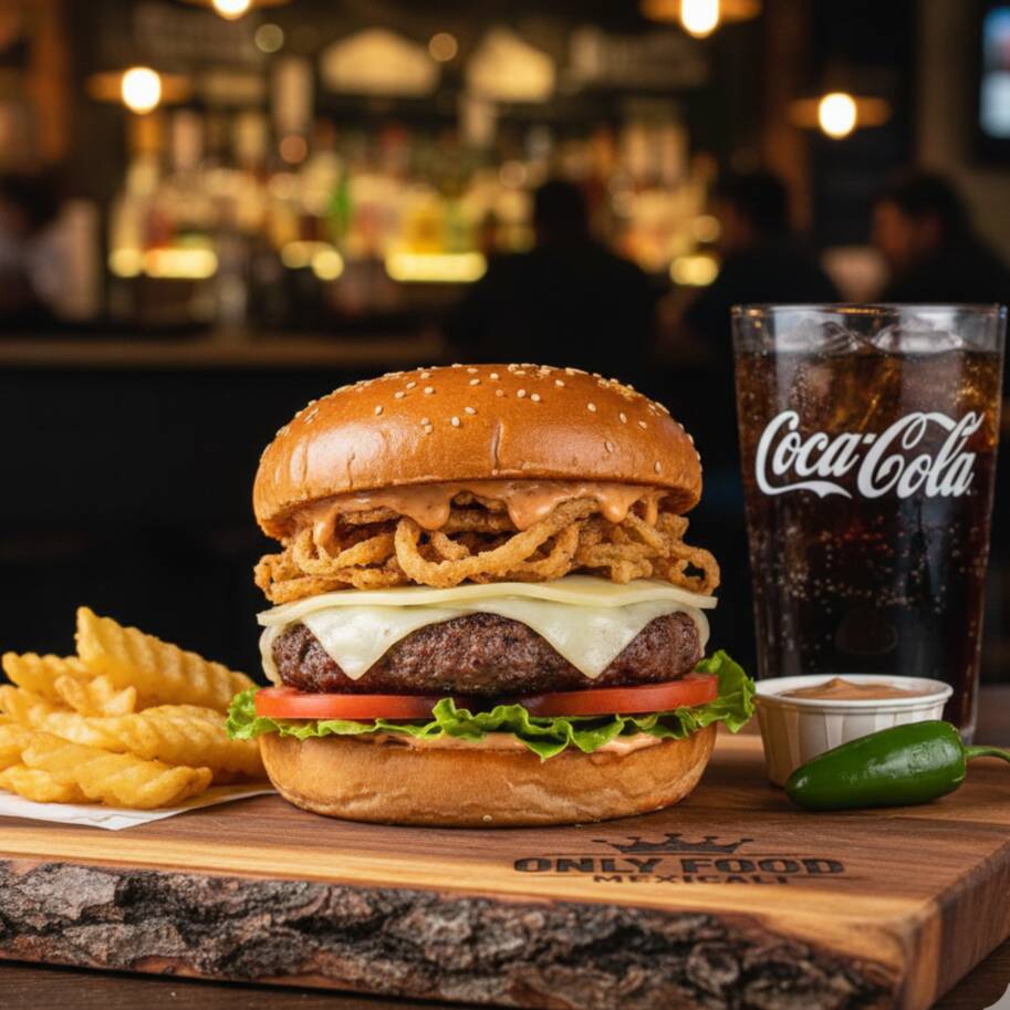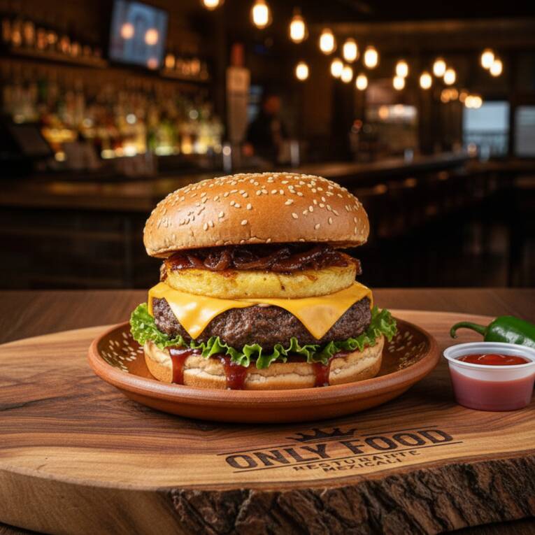 Delicia de este Universo , Creacion Original de Only Food, Carne 100% pura Sirloin , Queso, Cebolla Caramelizada , Crujiente Tocino , Aspirales de Ketchup Mayoneza y Moztaza , Y la Clave Abundante Chipotle que te mancha Algo Bien