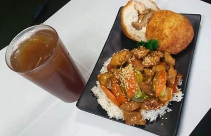 Teriyaki personal de pollo con vegetales: zanahoria, calabaza, chile morrón y ajonjolí; 1 sushibola de pollo y 1 vaso de té de 16 oz.