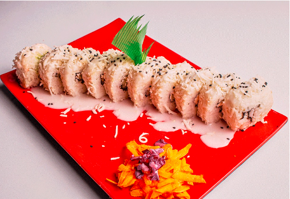 Rollo relleno de anguila, surimi, salmón fresco, capeado. Cubierto con tampico, los rollos llevan alga, pepino, aguacate y queso crema.