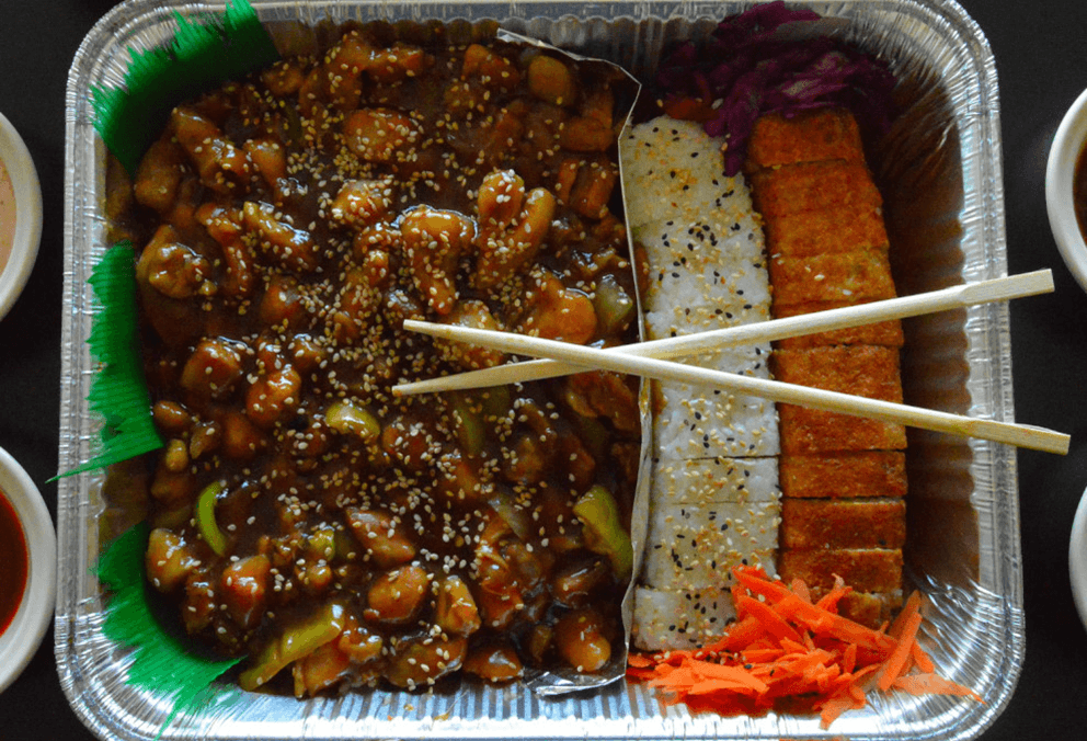Media Charola de Teriyaki de Pollo en Cama de Arroz Blanco y 4 Rollos california a Elegir (2 Rollos Nantural y 2 Rollos Empanizado)