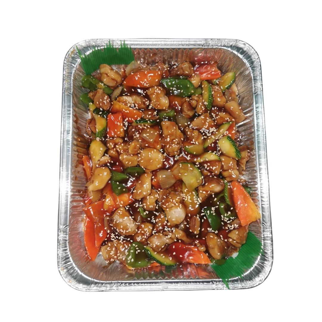 Charola Teriyaki de Pollo deshuesado en salsa teriyaki, arroz blanco, morron y cebolla