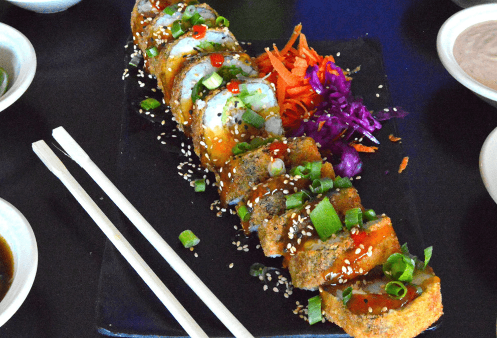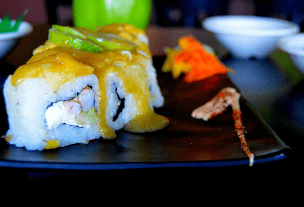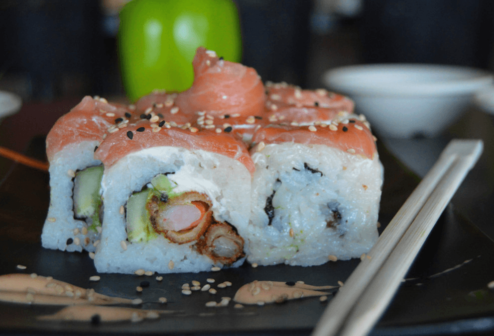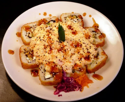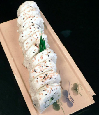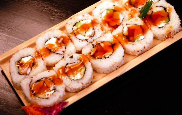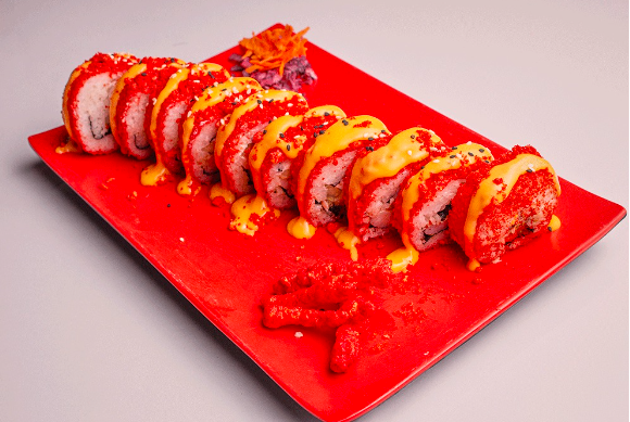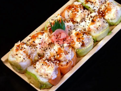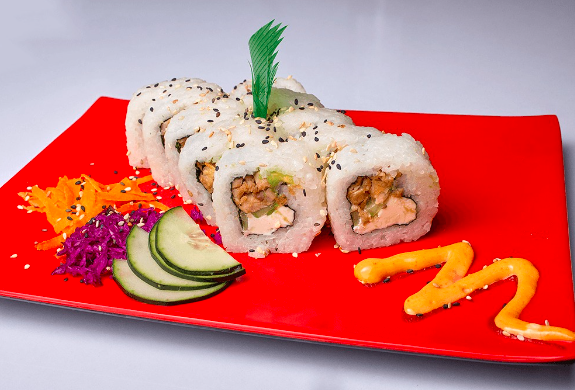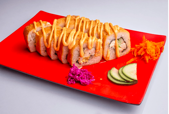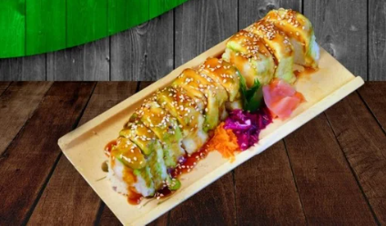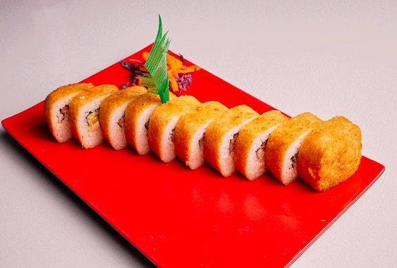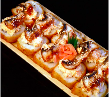 Rollo relleno de anguila, surimi, salmón fresco, capeado. Cubierto con tampico, los rollos llevan alga, pepino, aguacate y queso crema.