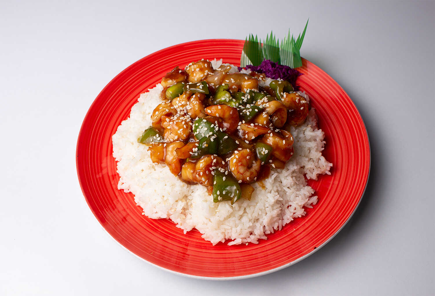 Teriyaki con camarón cocido bañado en salsa teriyaki y cama de arroz blanco. Llevan morrón y cebolla.