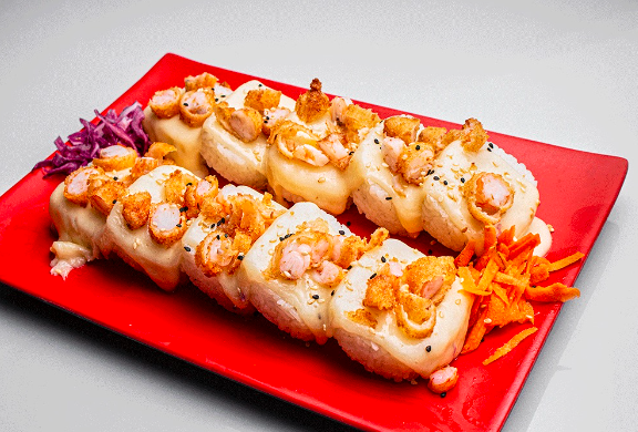 Rollo gratinado de tres quesos y topping de camarón empanizado. Llevan alga, pepuno, aguacate y queso crema.