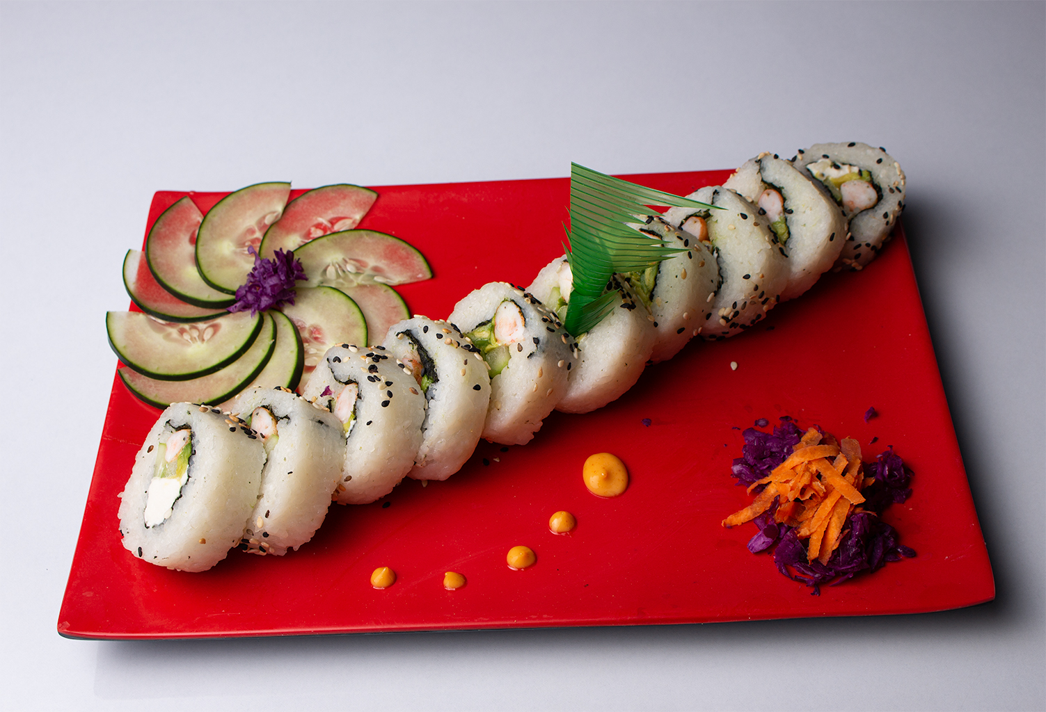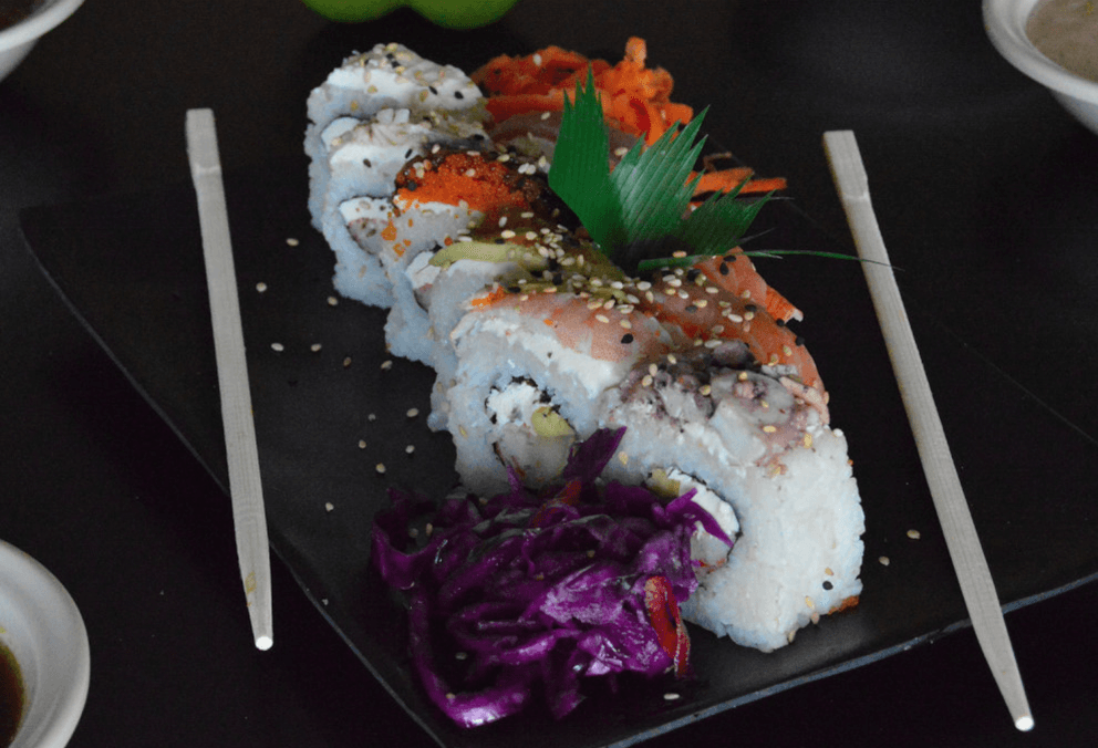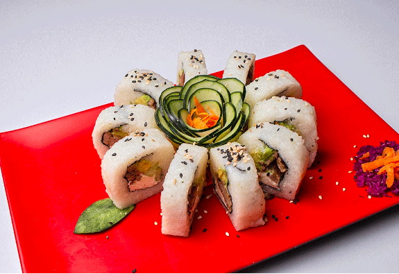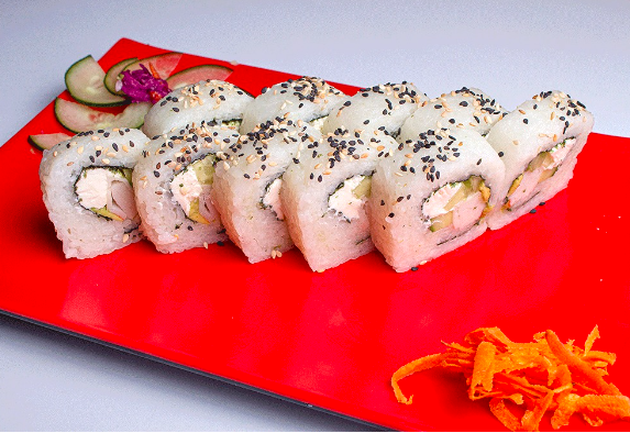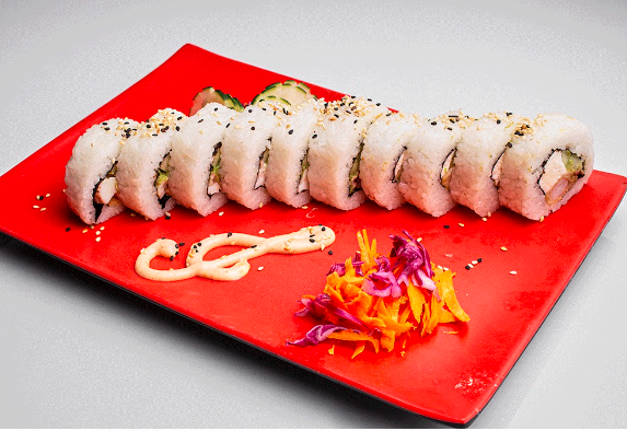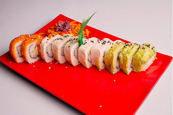 Rollo con kanikama forrado de atún, salmón, camarón, kanikama, pulpo y surimi. Cada rollo lleva alga, pepino, aguacate y queso crema.