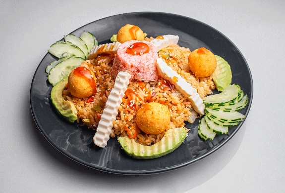 Arroz yakimechi con tampico, tiras de queso crema y bolitas de queso crema empanizadas. Acompañado de aguacate y salsa teriyaki.