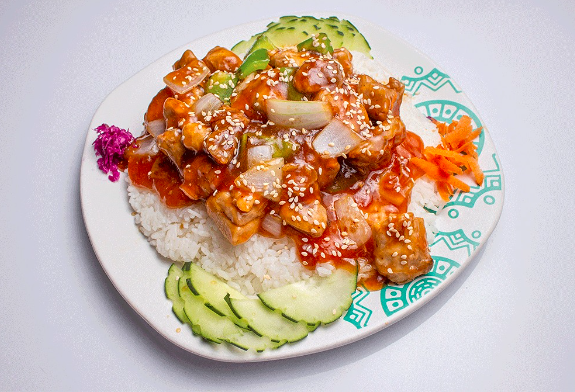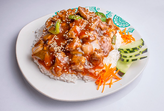 Teriyaki con filete de res y pollo bañado en salsa teriyaki y cama de arroz blanco. Llevan morrón y cebolla.