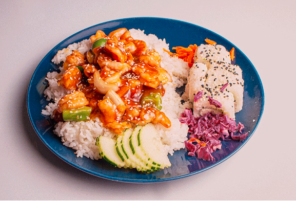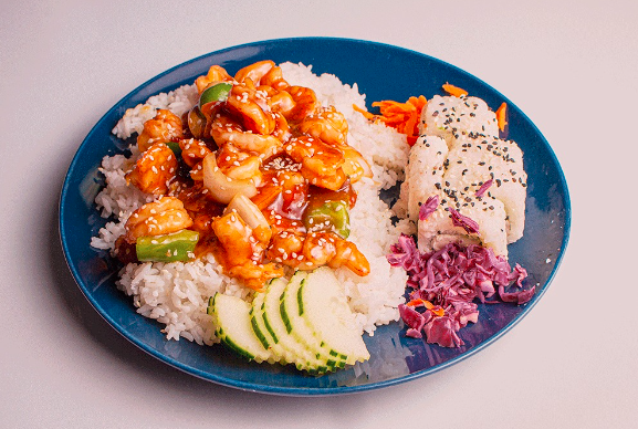 Teriyaki de Camaron en base de Arroz Blanco con chile morron y cebolla. Acompañado de 1/2 Rollo California a Elegir