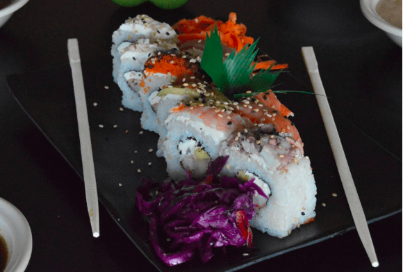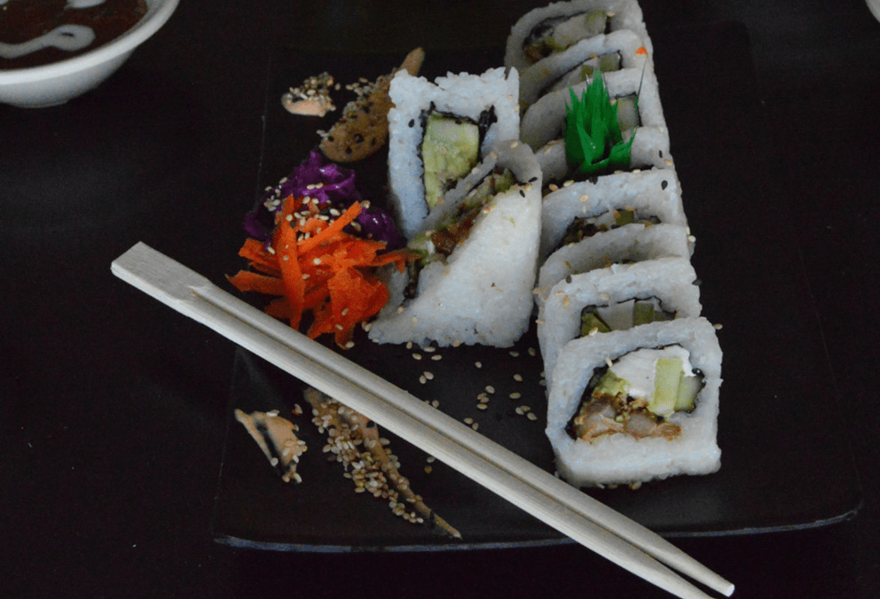 Rollo vegetariano con pepino, aguacate, zanahoria, alga, pepino, aguacate y queso crema.