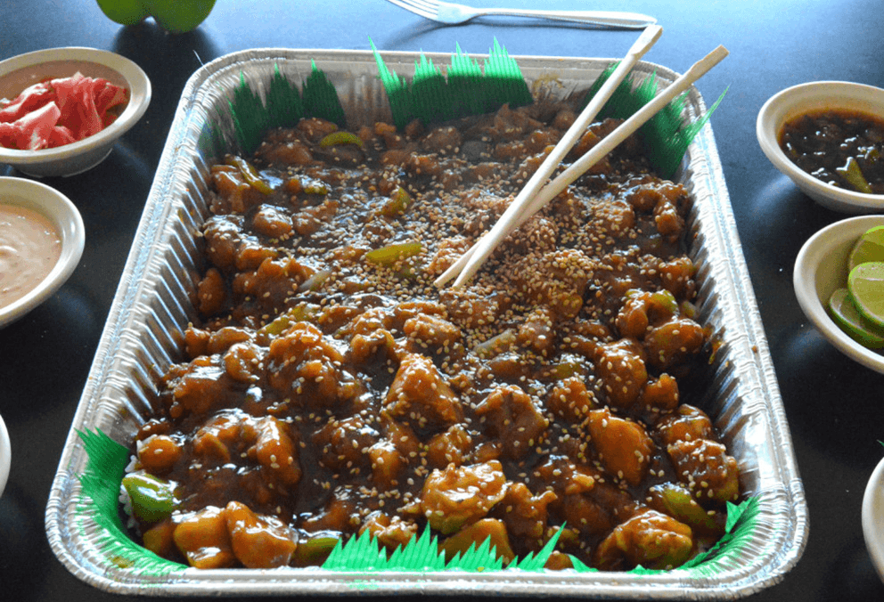 Media Charola de Teriyaki de Pollo en Cama de Arroz Blanco y 4 Rollos california a Elegir (2 Rollos Nantural y 2 Rollos Empanizado)