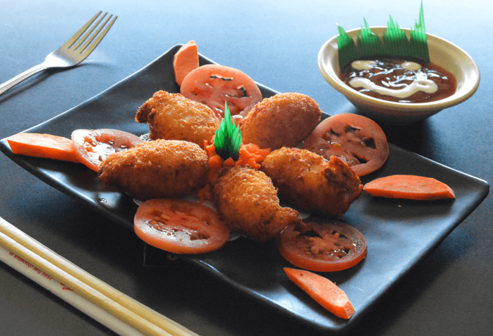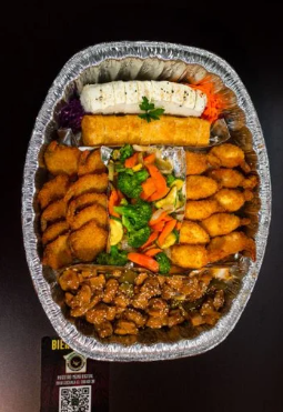 Charola Botanera Familiar con Teriyaki de Pollo, 4 Rollos de especialidad a elegir, 10 aros de cebolla, 10 jalapeños popers, 10 dedos de queso, 5 Verduras empanizadas (Calabaza, champiñón, brócoli y zanahoria), todo sobre una cama de lechuga.