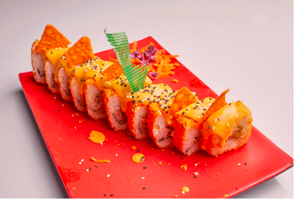 Rollo con carne asada, forrado con doritos y bañados en salsa de queso. Los rollos llevan alga, pepino, aguacate y queso crema.