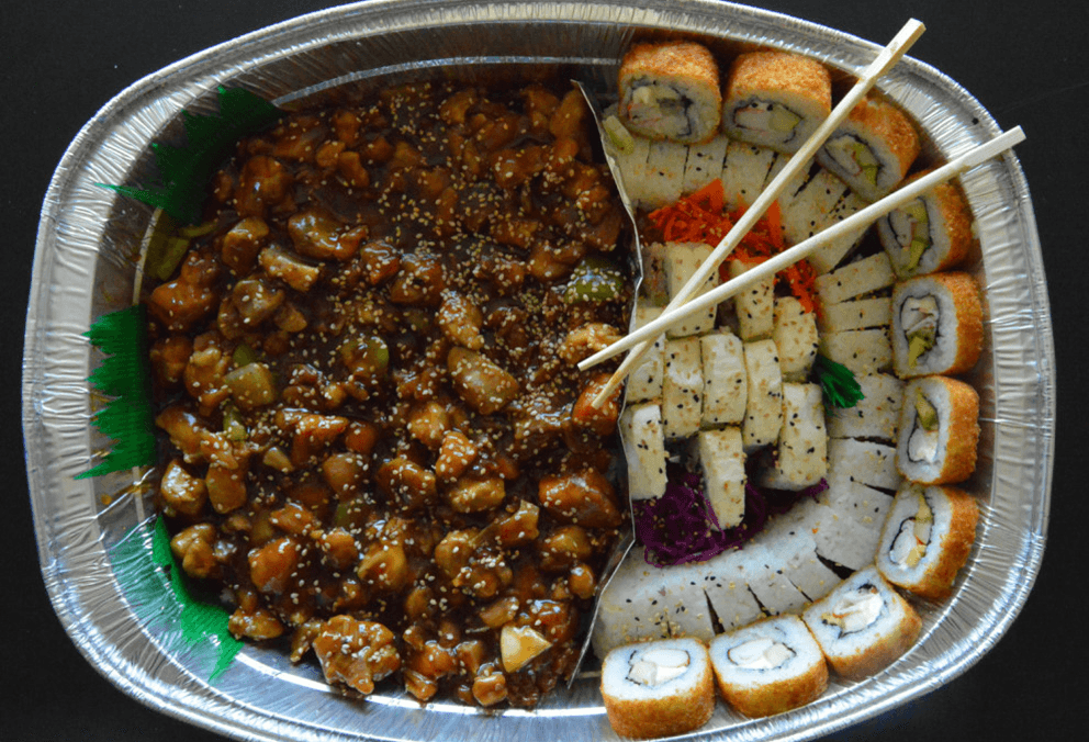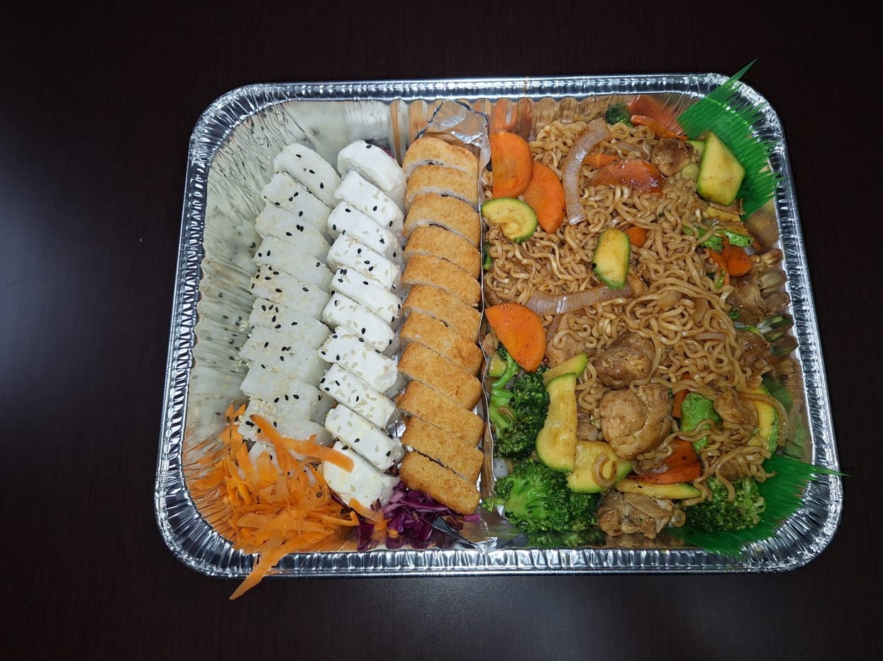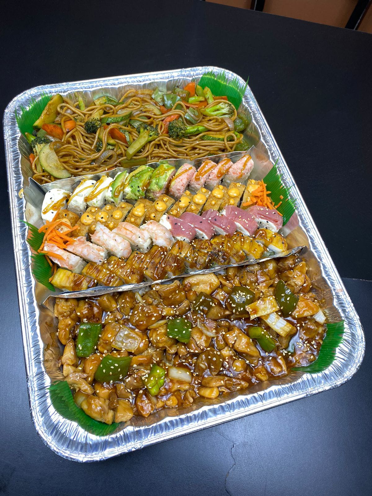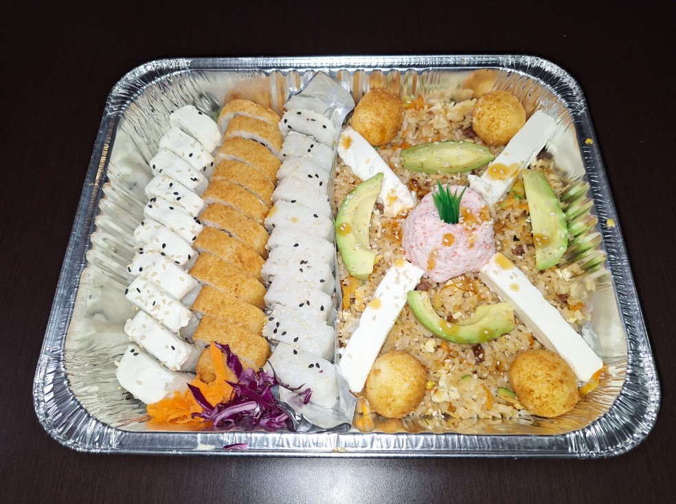 Charola combinacion especial grande, para 5-6 Personas con Teriyaki de Pollo, 4 Rollos de especialidad a elegir y Pasta con Vegetales.