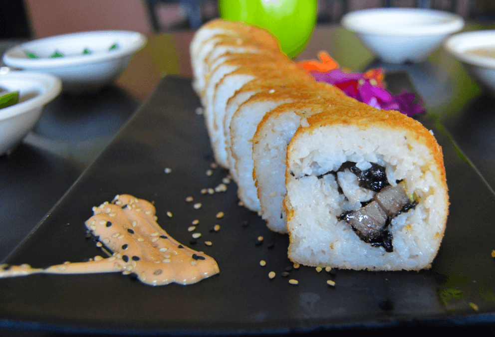Rollo con carne, queso manchego y toino bañado en salsa chipotle. Los rollos llevan alga, pepino, aguacate y queso crema.