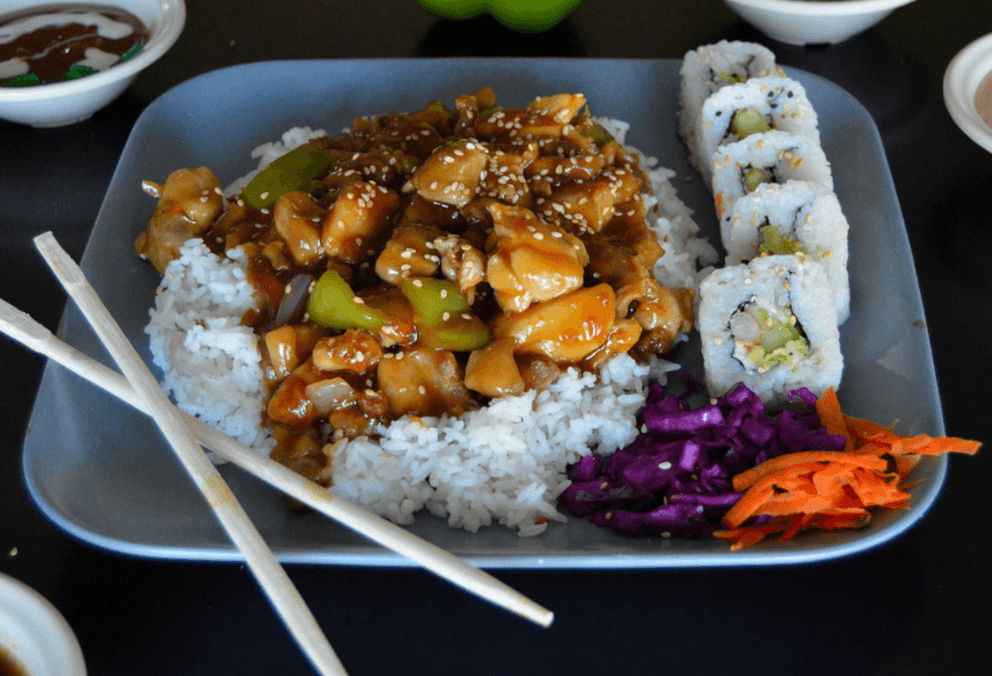 Teriyaki de Pollo en base de Arroz Blanco con chile morron y cebolla. Acompañado de 1/2 Rollo California a Elegir