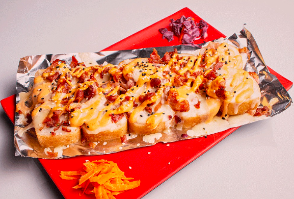 Rollo con camarón, empanizado y gratinado con tocino y queso monterrey bañado en salsa especial. Los rollos llevan alga, pepino, aguacate y queso crema.