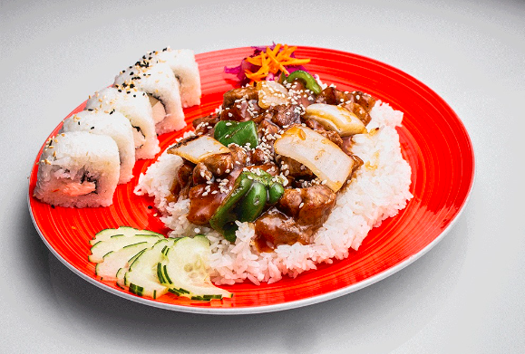 Teriyaki de Res y Pollo en base de Arroz Blanco con chile morron y cebolla. Acompañado de 1/2 Rollo California a Elegir