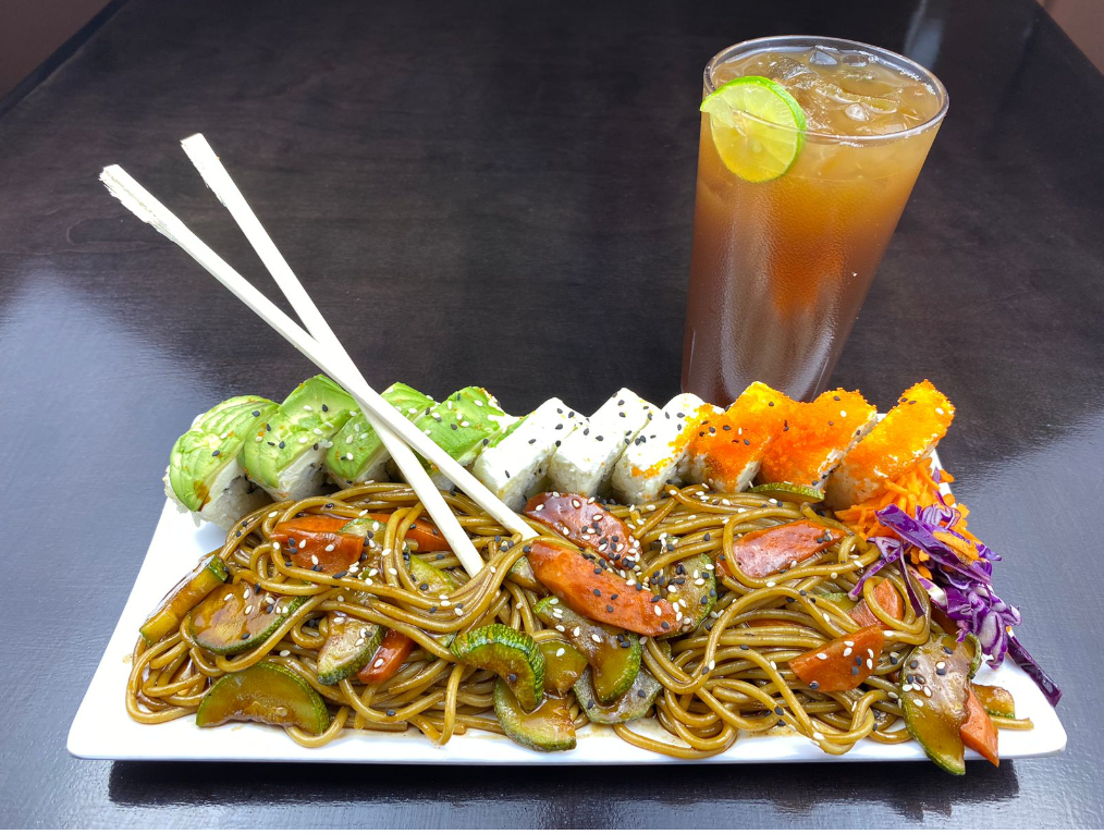 Elige un sushi de especialidad, acompañado de pasta con vegetales bañada en salsa de la casa y té de la casa