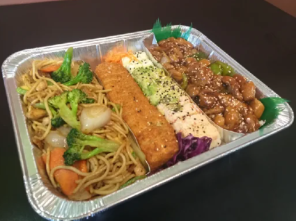 3 Rollos California, Empanisado, forrado y natural, elige tu proteína favorita, acompañado de un delicioso Yakisoba de pollo.