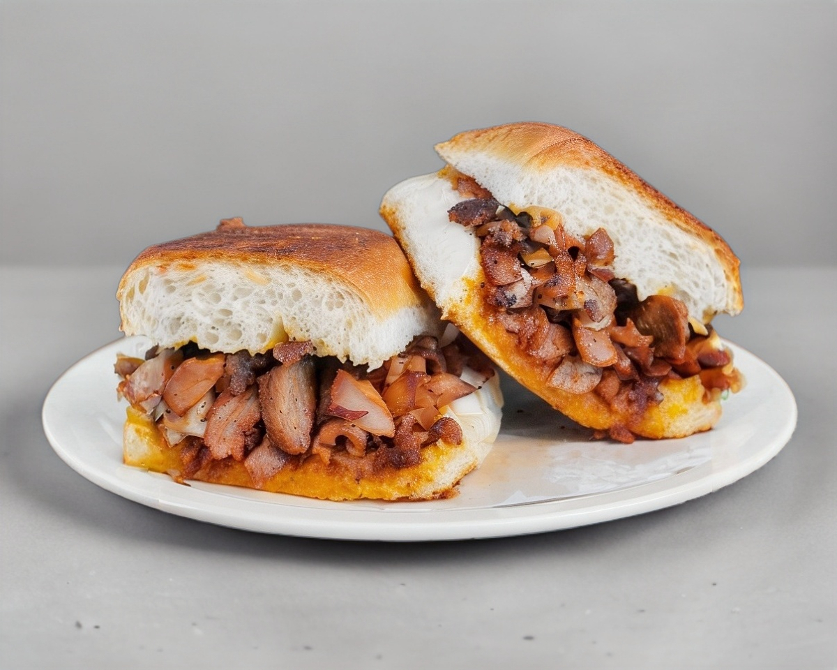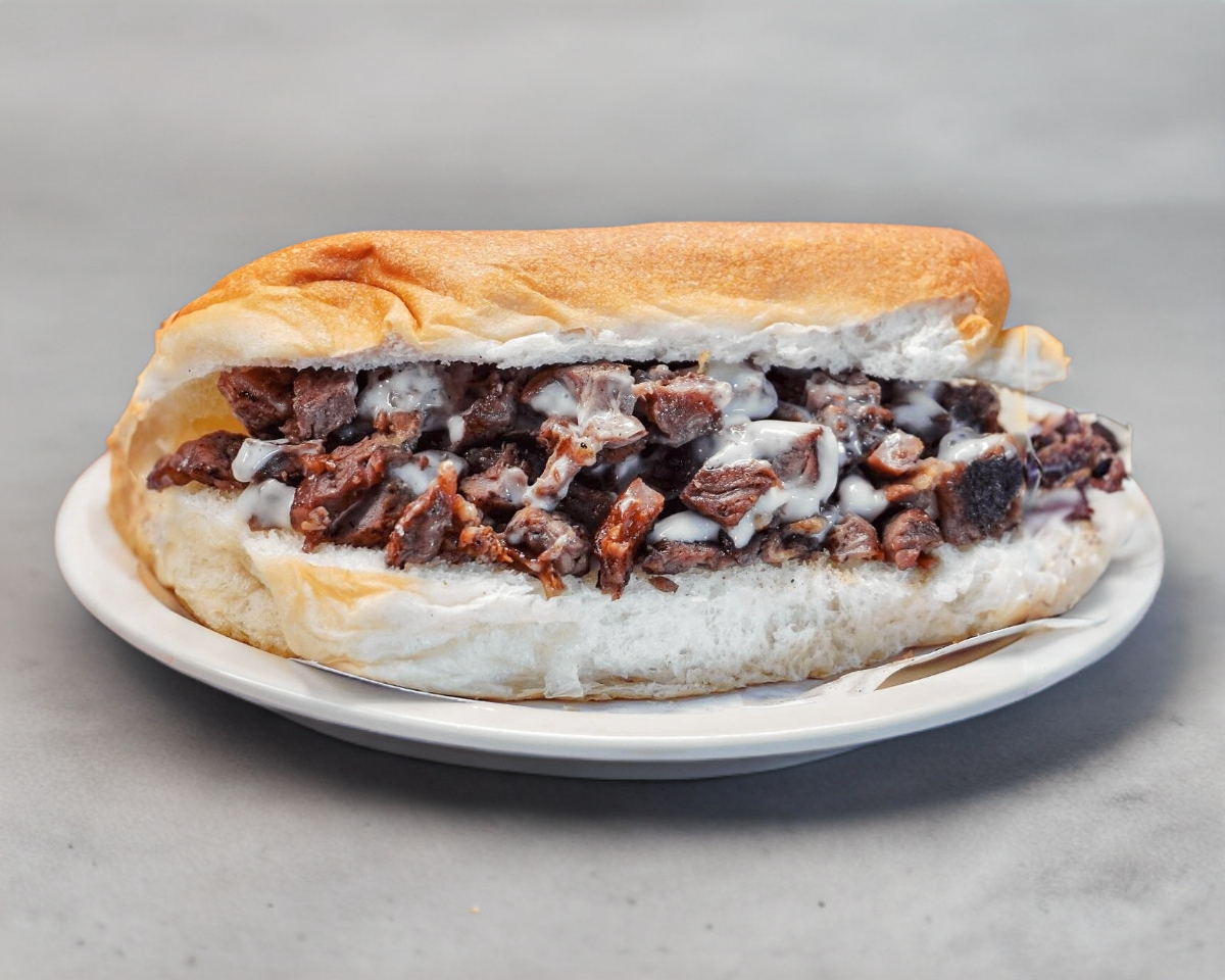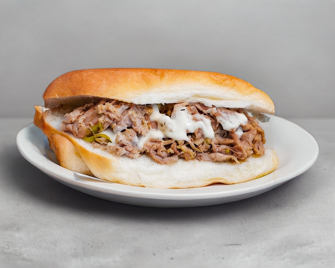 Torta de carne en tiras , con mayonesa, en pan telera.