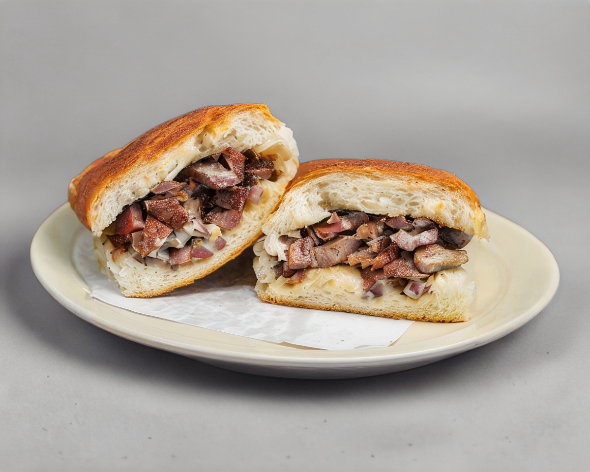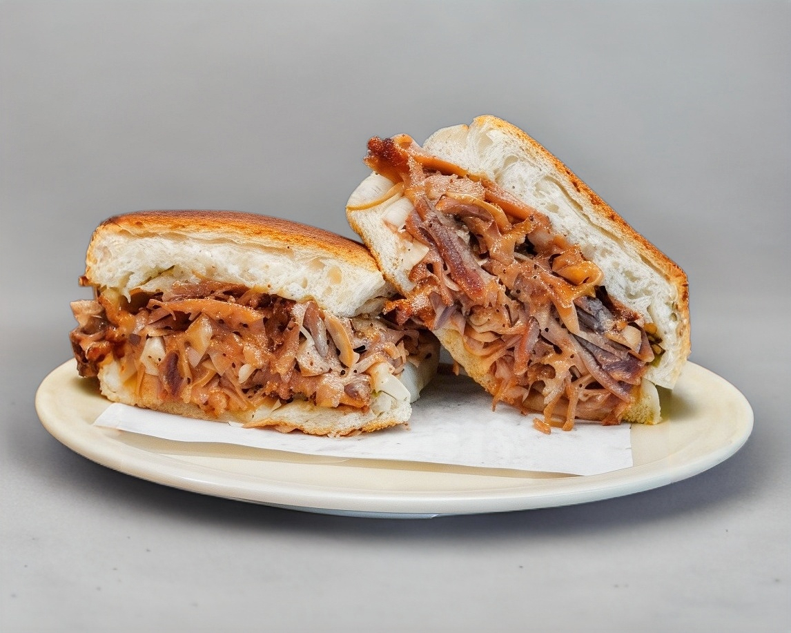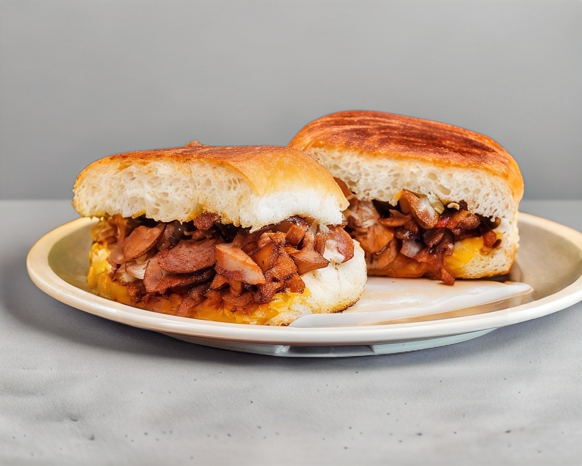 Torta de carne en tiras , con mayonesa, en pan telera.