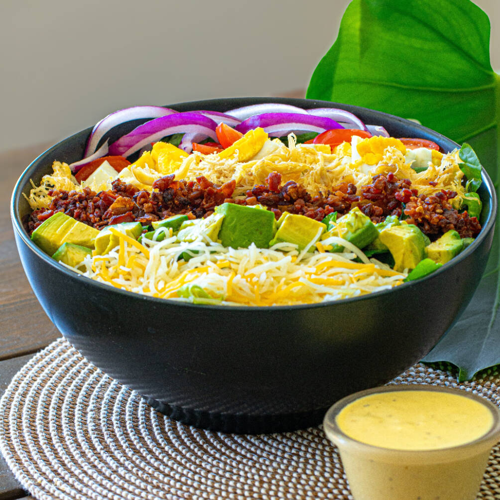 Lechuga romana+pechuga de pollo+tomate cherry+aguacate+queso+huevo cocido+cebolla morada+tocino (aderezo empacado separado)