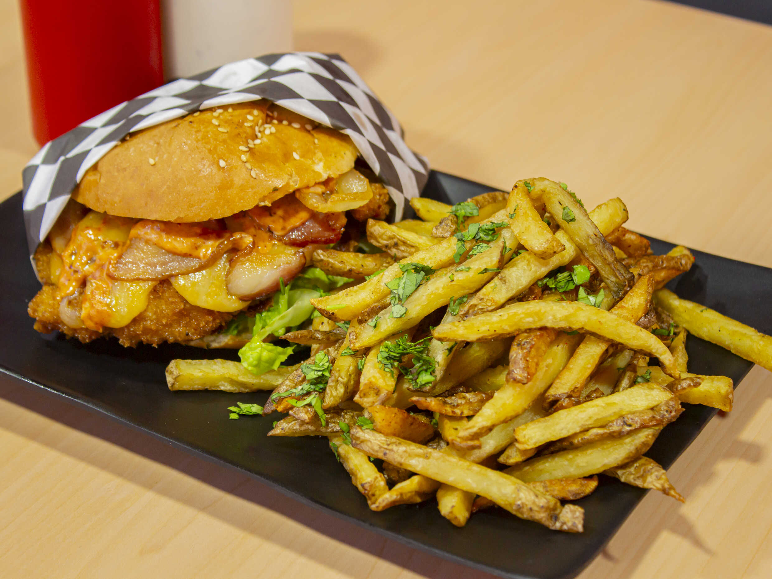 Carne a la Plancha, Queso Amarillo, Tocino, Lechuga, Tomate, Cebolla y Aderezo Chipotle.