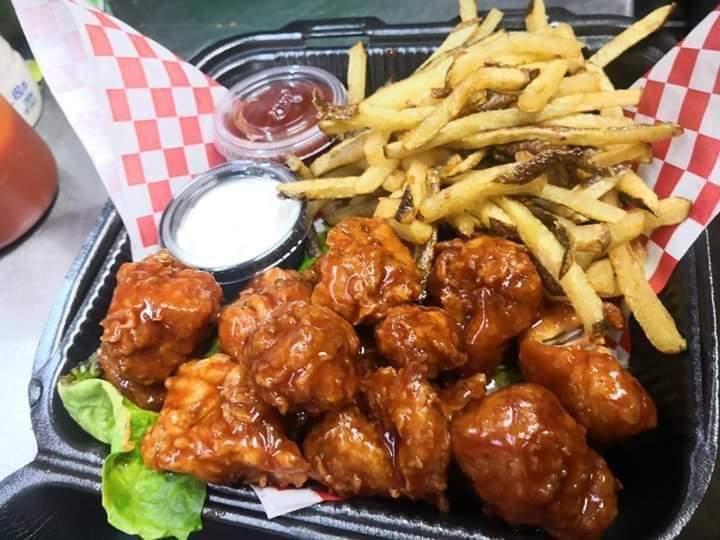 Boneless, dedos de queso, aros de cebolla, papas fritas y aderezos.