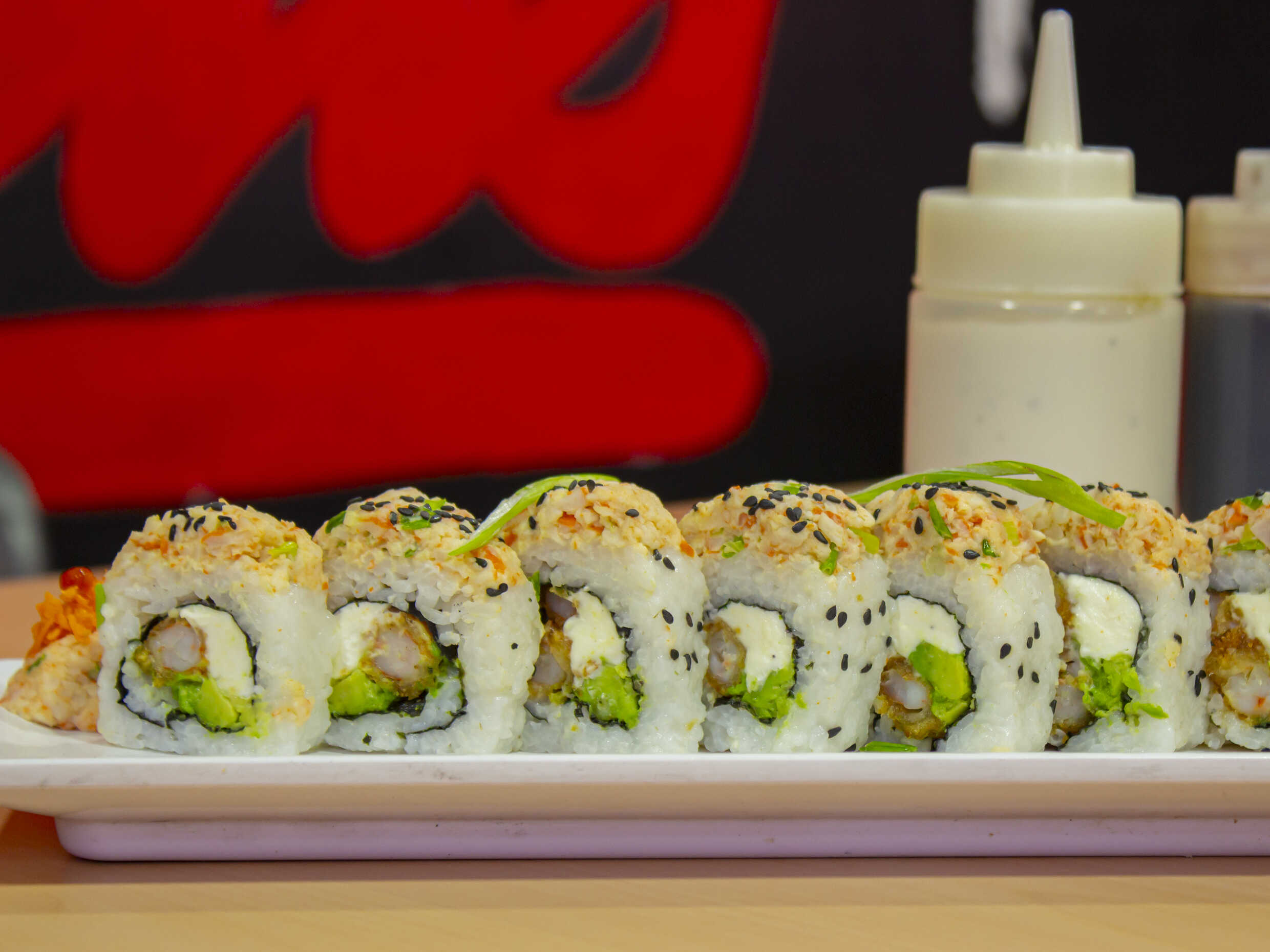 Res, jalapeño, philadelphia, aguacate, empanizado y tampico por arriba, camarón, chipotle y salsa anguila.