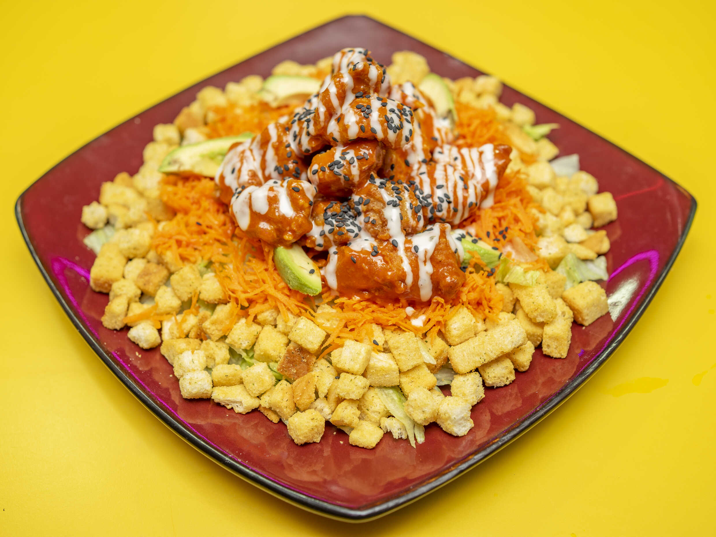 Lechuga, Zanahoria Rayada, Aguacate, Boneless Buffalo, Crotones y Aderezo Ranch.