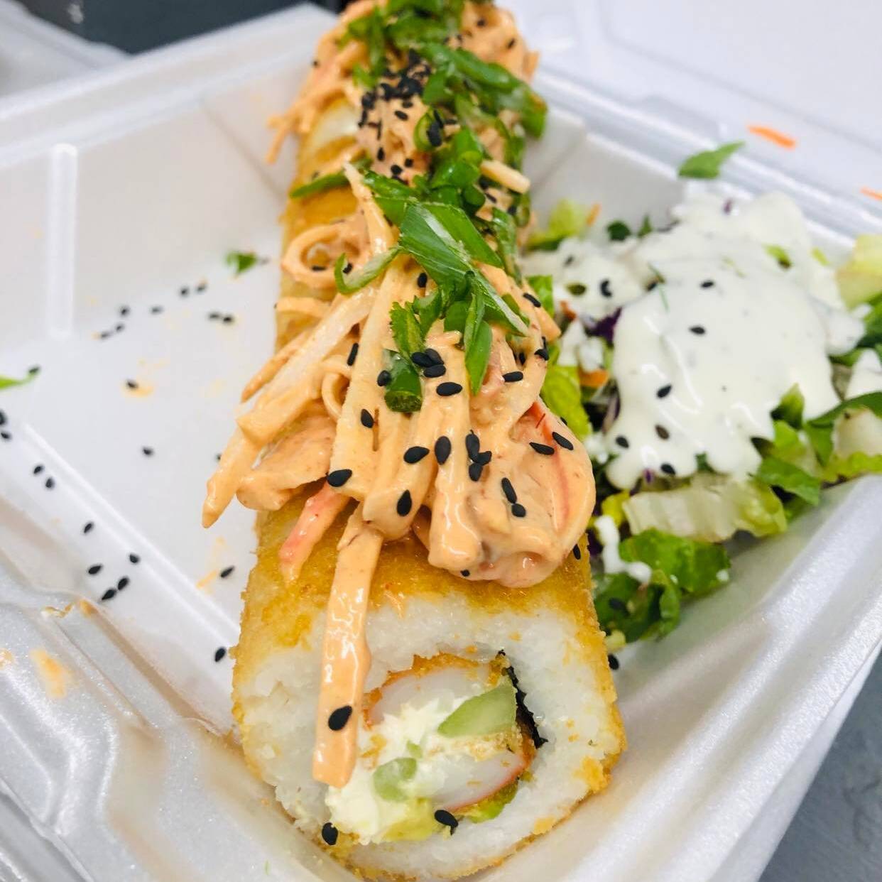 Surimi, pepino, aguacate, philadelphia, por fuera bolitas de tampico y sriracha.