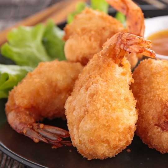 Camarón empanizado, aguacate, queso crema, empanizado, gratinado con queso Monterrey, topping de camarones chipotle y aguacate.