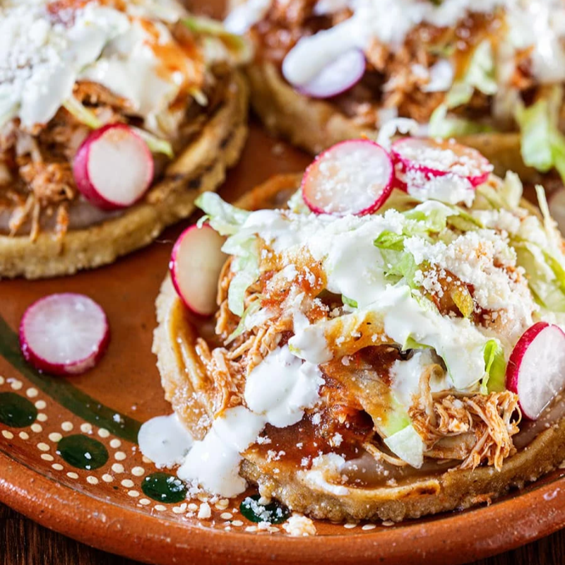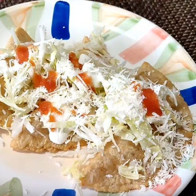 FRIJOLES, LECHUGA, POLLO, CREMA,QUESO COTIJA Y CEBOLLA