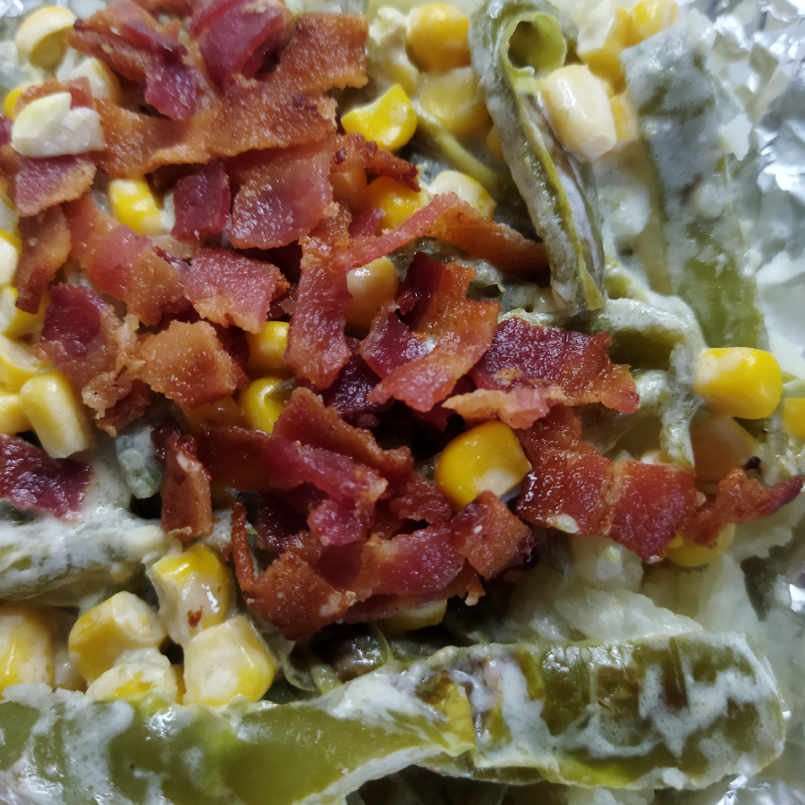 Papa horneada y zasonada con crema entera, queso mozarella, mantequilla, sal y pimienta, con relleno de "rajas de chile poblano asado" con crema, granos de elote y trozos de tocino bien doradito.