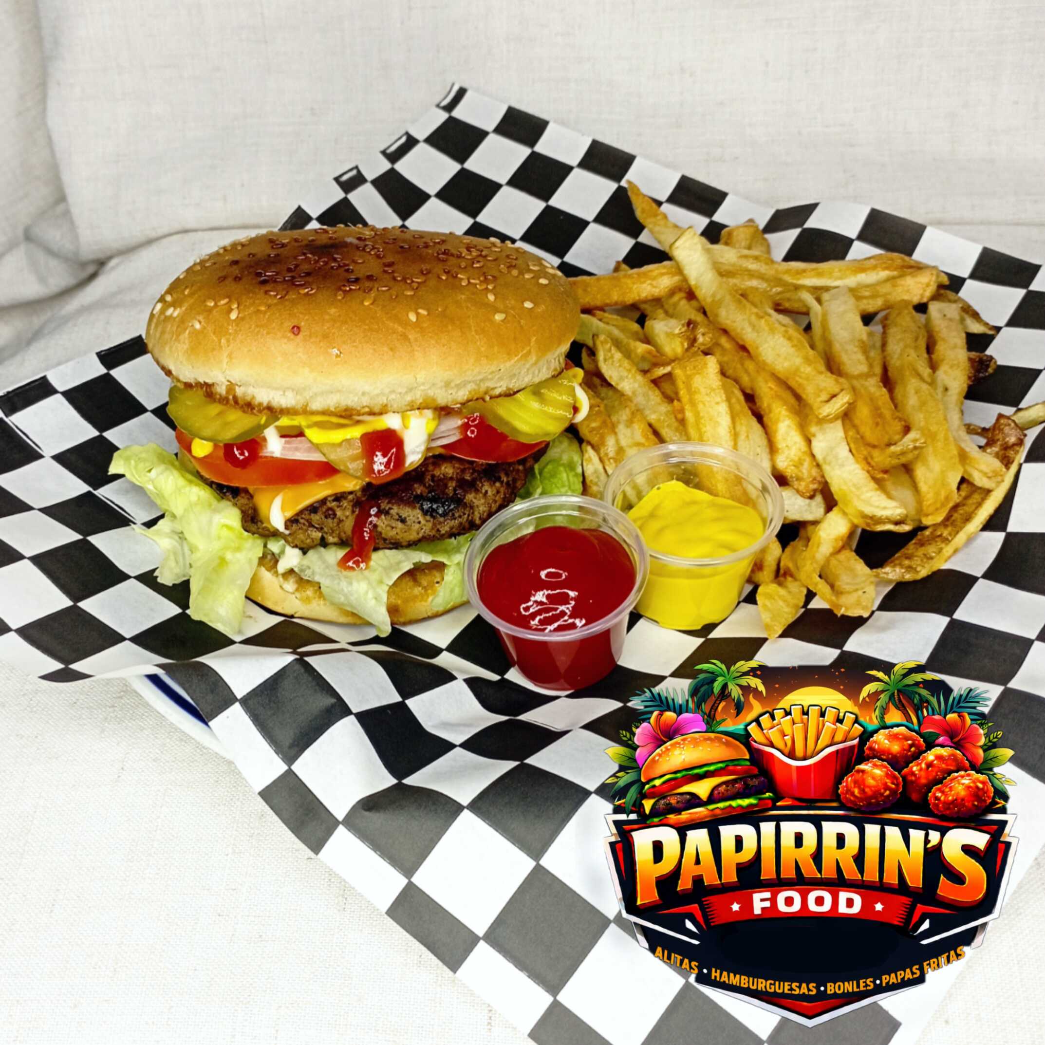 Carne 100% de res, queso amarillo, lechuga, tomate, cebolla, pepino, ketchup mostaza, mayonesa acompañado de papas fritas