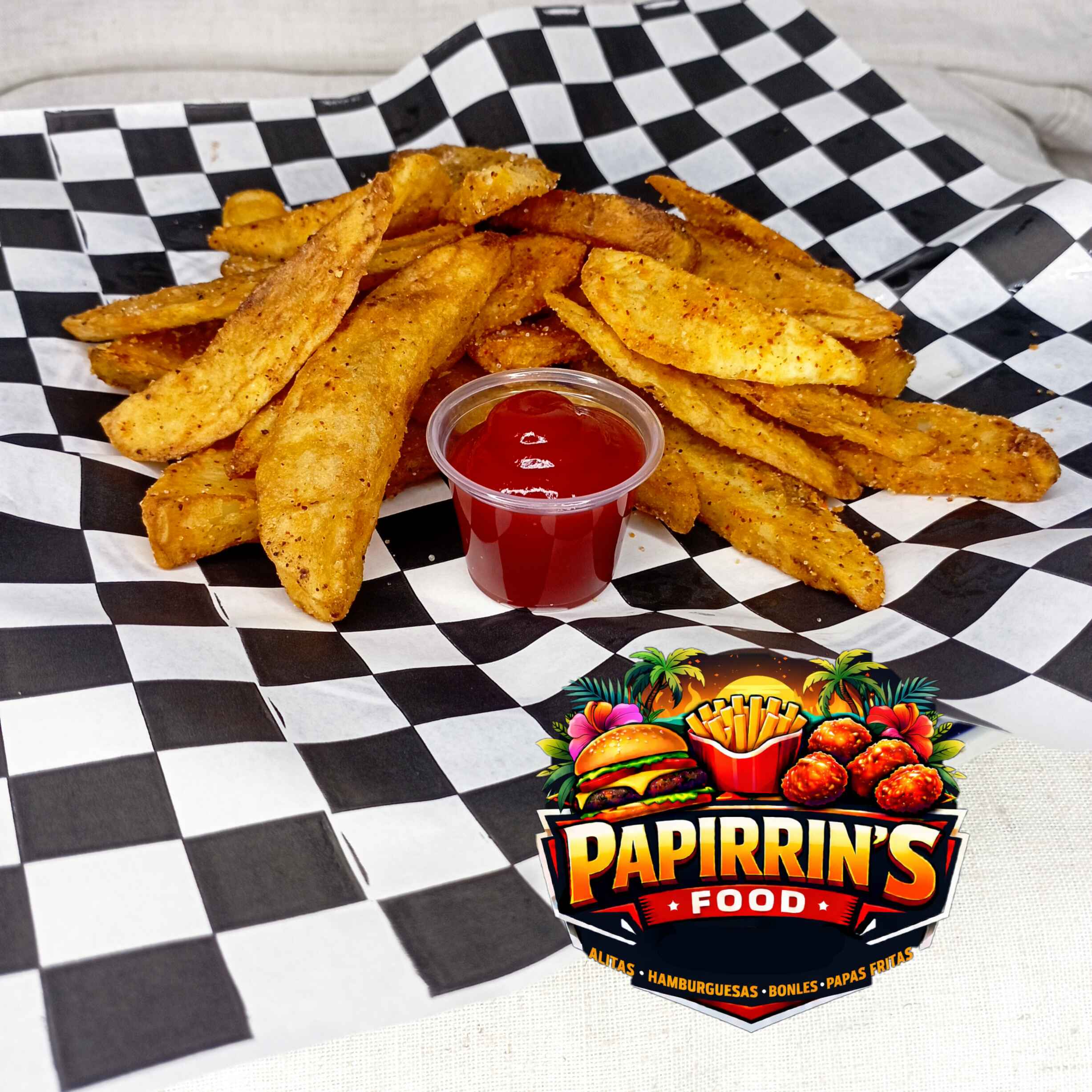 Orden de papas natural cortadas en gajos sazonadas con la receta de la casa acompañadas de salsa de tu elección ketchup, ranch o BBQ.