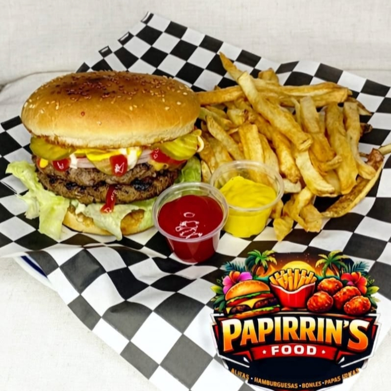 Dos Carnes 100% de res queso lechuga tomate cebolla pepinillo ketchup mayonesa mostaza acompañado de papas fritas