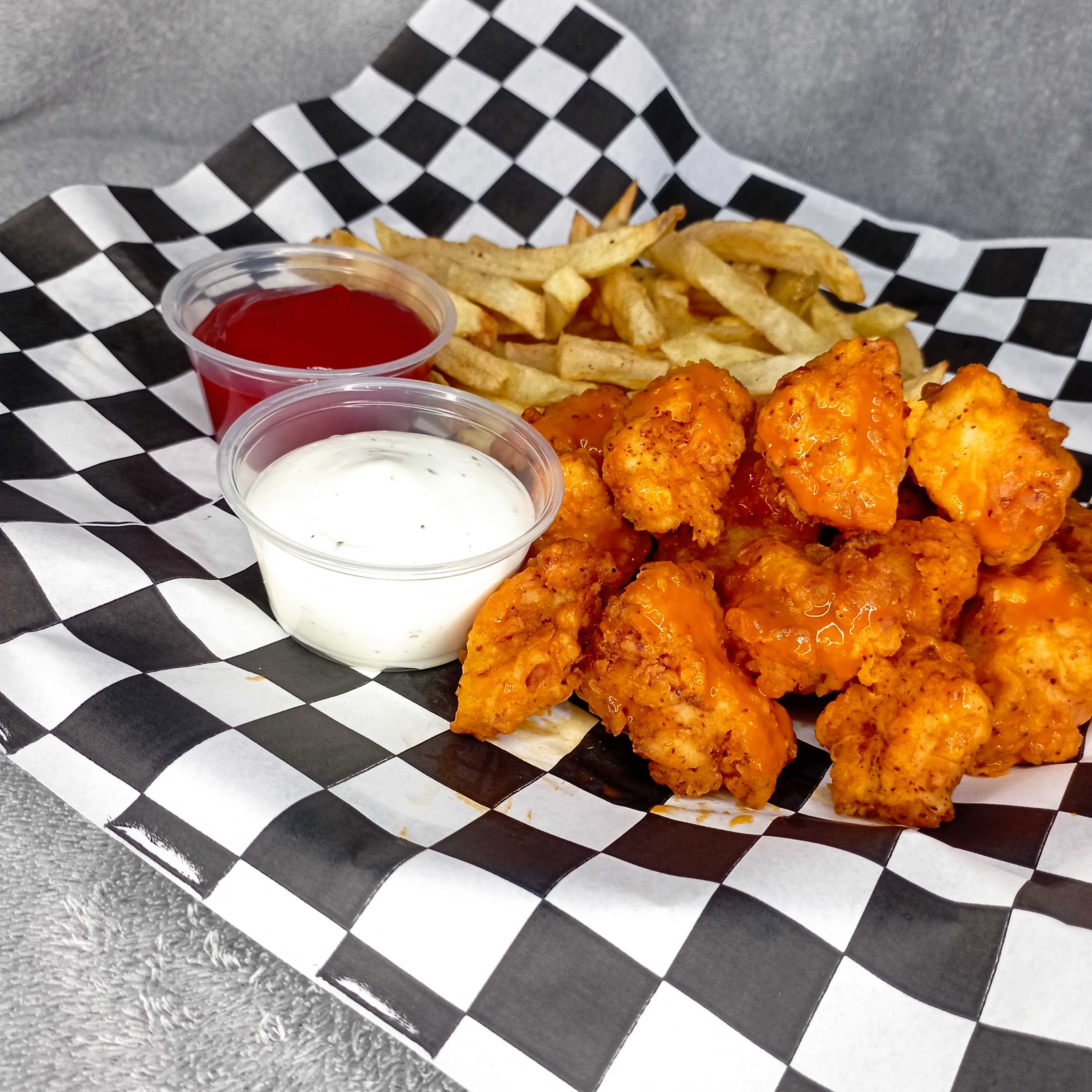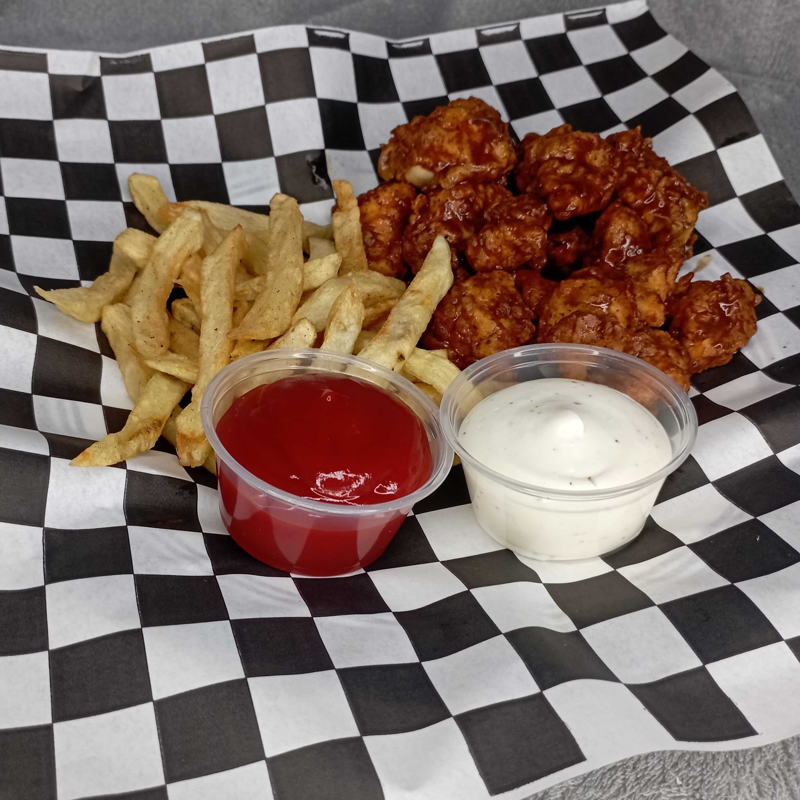 Trozos de pechuga de pollo empanizado y sazonado con la receta de la casa bañados en salsa de tu elección BBQ acompañado de ranch y papas a la francesa.
