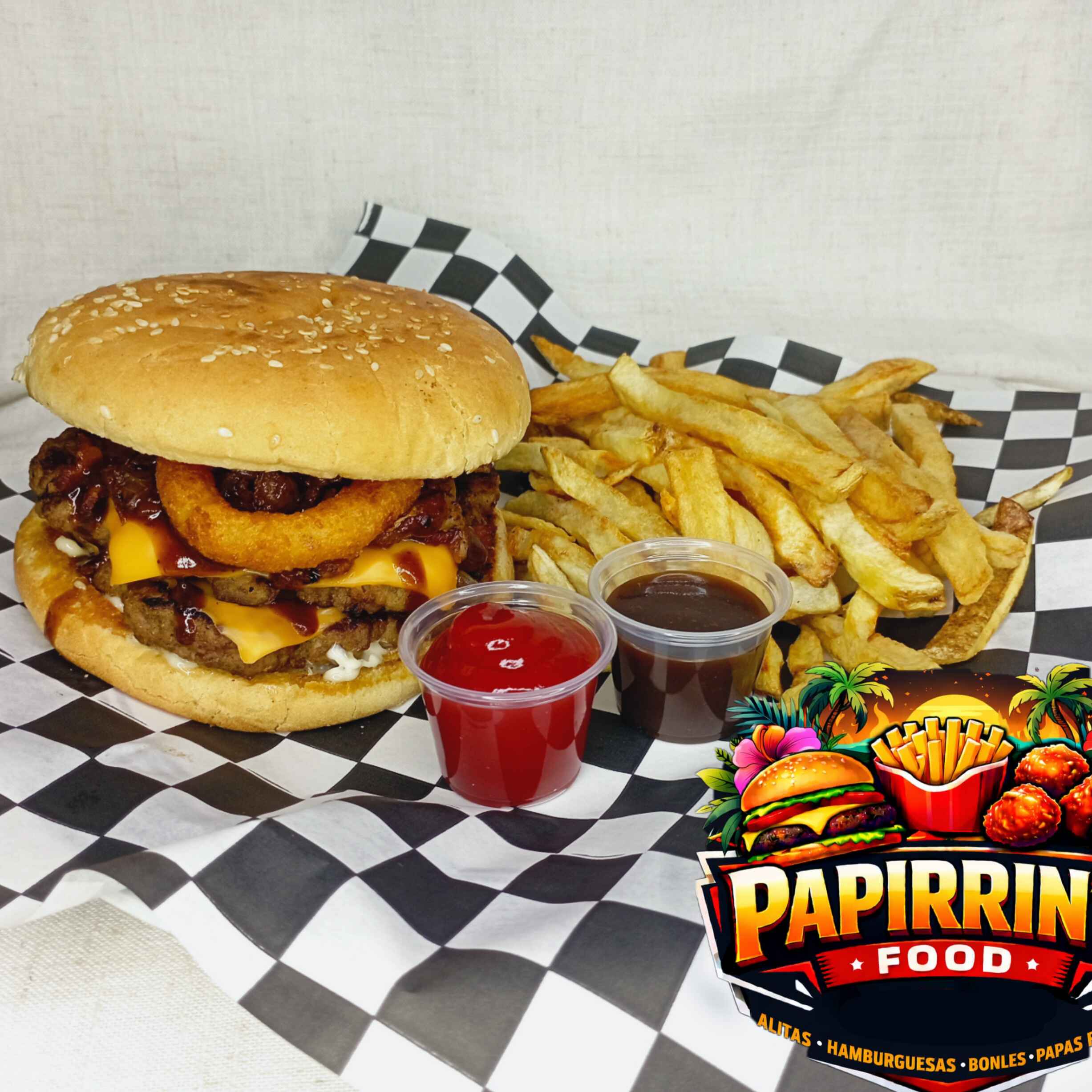 Carne 100% de res, queso amarillo, aros de cebolla, Mermelada de tocino y salsa BBQ acompañada de papas fritas.