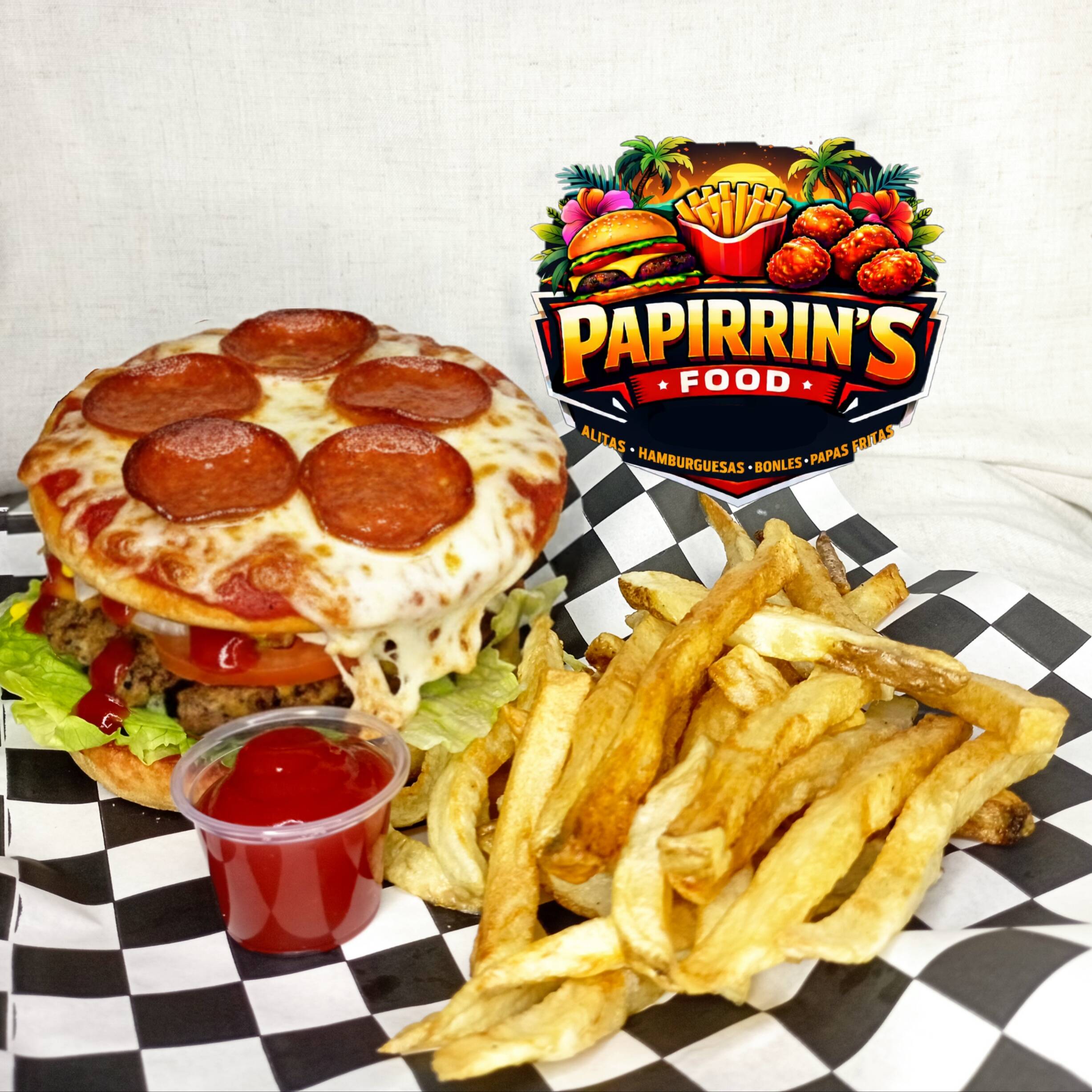 Carne de res queso amarillo tomate cebolla pepinillo lechuga ketchup mayonesa mostaza y en la tapa una mini pizza de pepperoni con queso mozzarella acompañado de papas alas francesa