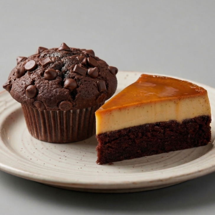 Combo ideal para compartir, incluye un muffin Hershey’s de chocolate y una rebanada de chocoflan.