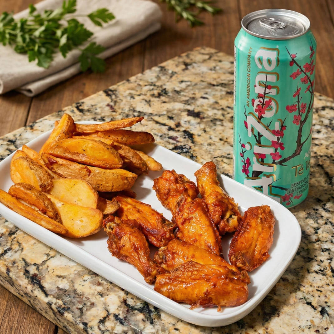 6Pz Alitas Picositas Con Dip Ranch*1 + Papas en Gajo Con Dip Ranch y Catsup*1 + Te Verde ARIZONA 460ml*1