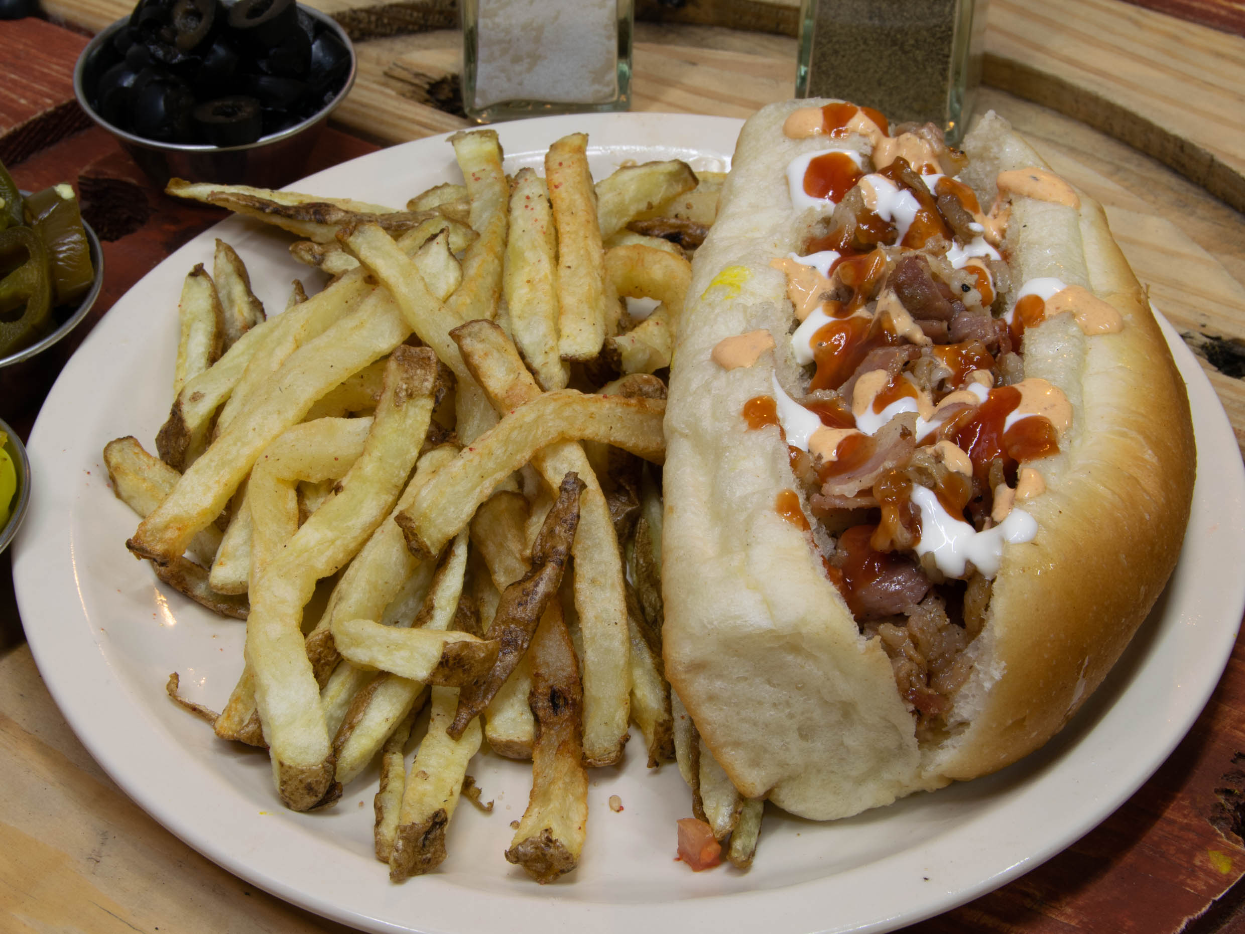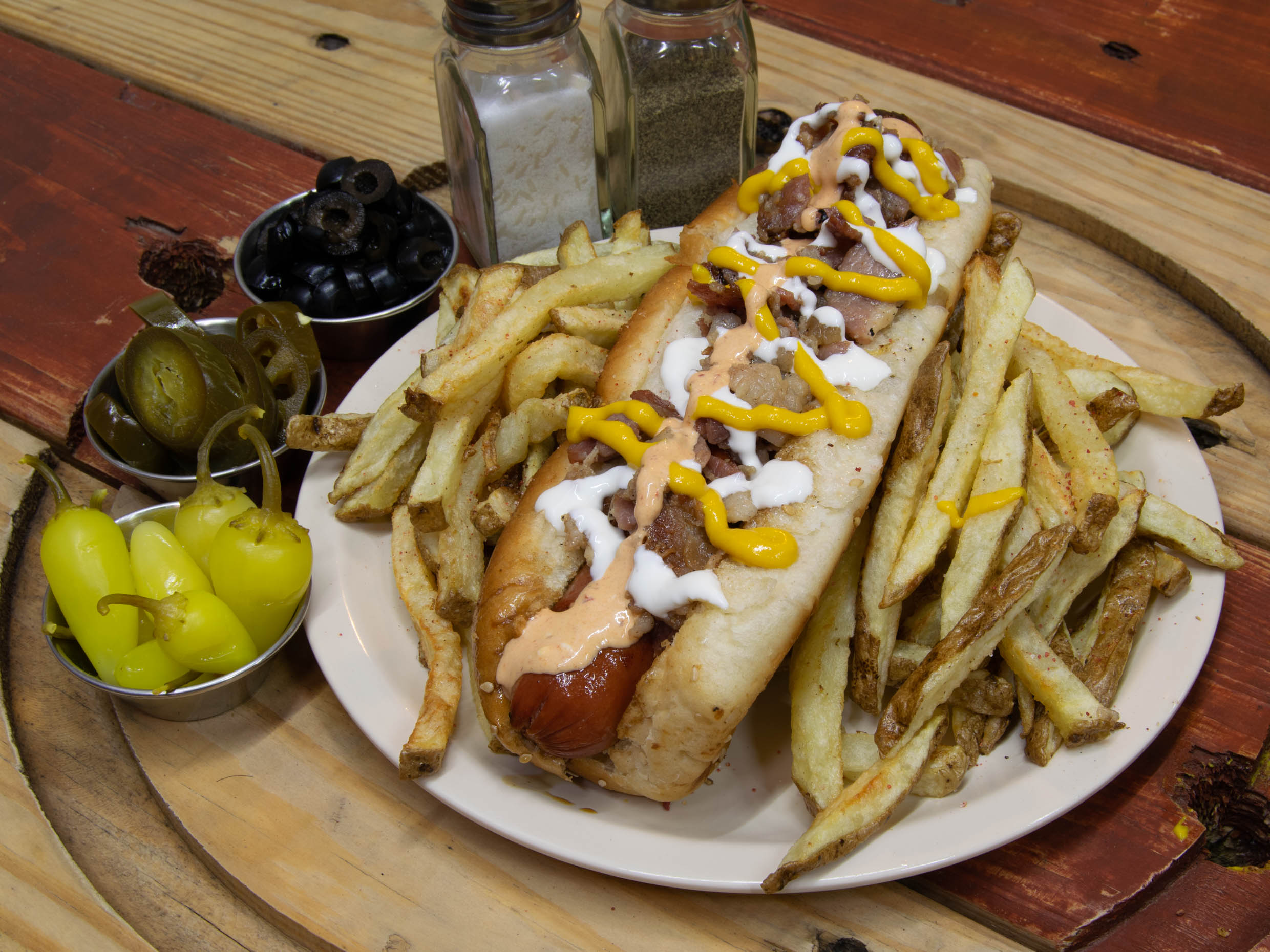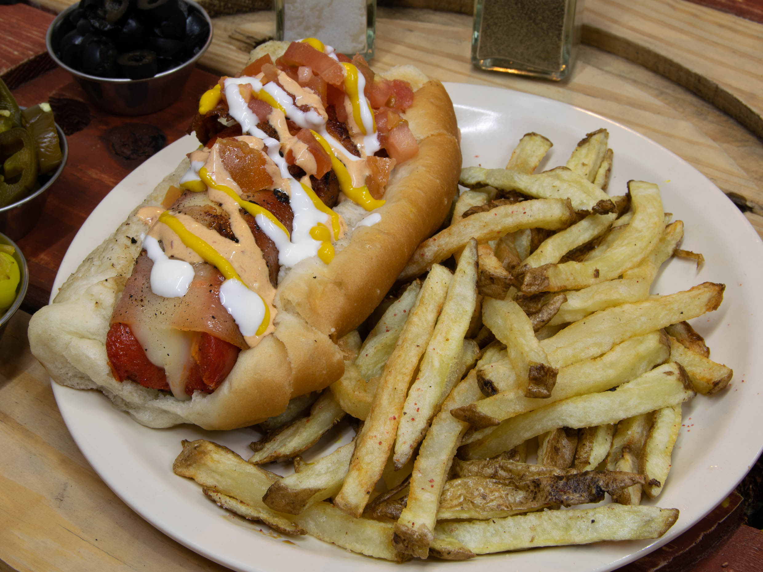 pan de rancho,salchicha,tocino,tomate,cebolla,aderezos